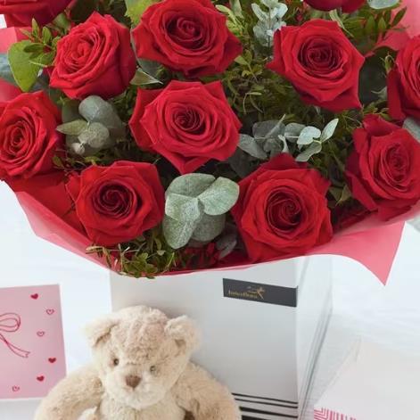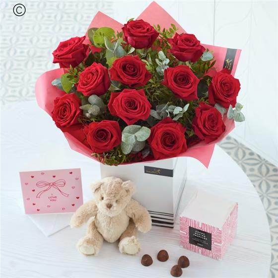 A classic dozen luxury red roses, plus an adorable teddy bear, scrummy chocolates and a card too – this one ticks every single Valentine's box, they're going to love it